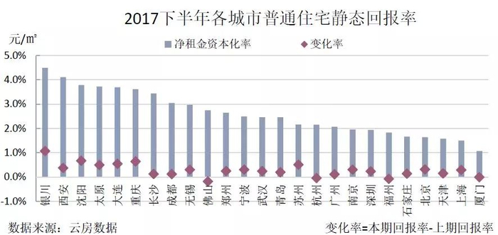 从大部分普通住宅的静态回报率来看,2017下半年各城市普通住宅静态回报率不等, 净租金资本化率的前三甲城市是银川,西安、沈阳,此外,太原、大连、重庆、长沙、成都、无锡、佛山也位列前十名。