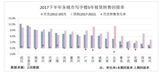 5年租赁后转售方面,在转售回报整体下滑背景下,一线城市写字楼转售回报逐渐下滑。预期写字楼未来展前景看好,转售回报上行。其中,北京转售回报上行明显,上海预期收益最低。武汉、石家庄历史租赁转售收益较高。2017下半年,受价格上升明显影响,武汉、石家庄转售回报率处于较高水平。从预测回报率上看,多数城市转售回报率上涨,一方面,写字楼市场具备良好的发展空间,另一方面,住宅市场政策不断收紧,势必会有大量资金流入写字楼市场,价格或将持续走高。《报告》预测2017—2022年5年租赁转售回报率排名前十位的是,北京、长沙、石家庄、武汉、天津、郑州、南京、广州、深圳、重庆。