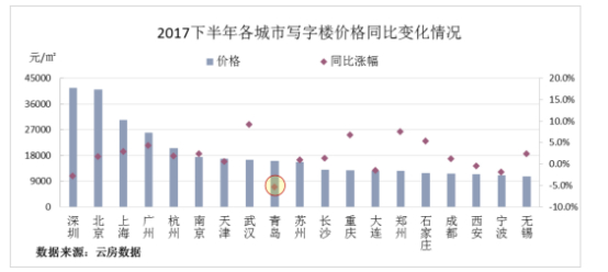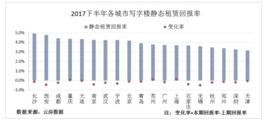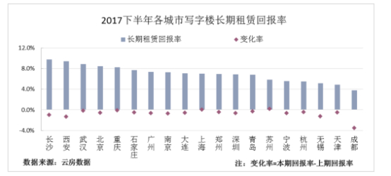 写字楼投资回报率水平也在数据中有所体现。根据云房数据研究中心发布的《2017下半年中国房地产投资回报率调查报告》(以下简称《报告》)显示,按照19个典型城市写字楼的静态租赁、长期租赁、5年租赁后转售三类投资指标进行综合分析:西安成为十分适宜投资的城市;长沙、武汉是适宜长租的城市;适宜转售的城市为深圳、上海;和普通住宅和高端住宅的市场表现一样,宁波再次垫底,被认为是最不适宜投资的城市。