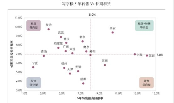 综上所述,不同物业类型租赁及销售各自主导型的城市价值导向图显示结果为:西安成为十分适宜投资的城市;长沙、武汉是适宜长租的城市;适宜转售的城市为深圳、上海;和住宅市场的表现一样,宁波被认为是最不适宜投资的城市。
