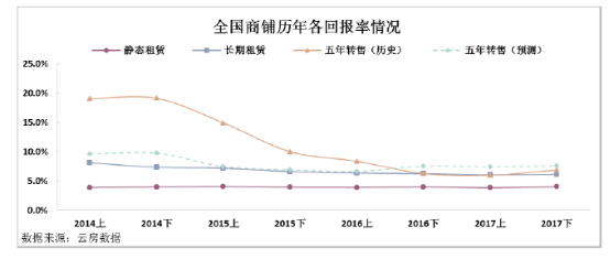 商业市场成交价格涨幅走低的,致使转售投资回报率持续下降。从历史数据来看,2017下半年19城市租赁后转售回报率较上一周期下降0.6个百分点,其中宁波、青岛、长沙、石家庄转售回报率不及五年期贷款利率(4.9%)。