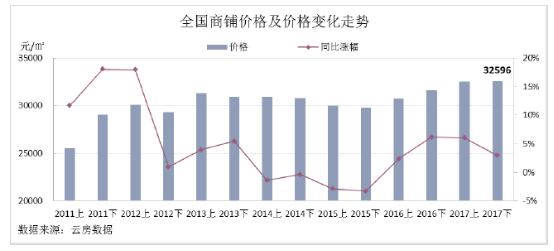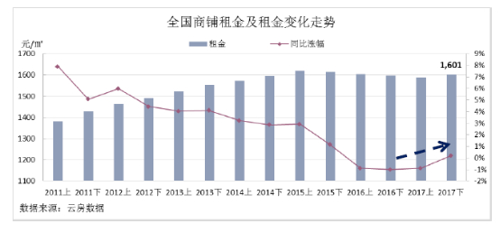 根据云房数据研究中心发布的《2017下半年中国房地产投资回报率调查报告》(以下简称《报告》)显示,自2012年起,在电商的冲击下,商铺租金明显回落。2016上半年至2017上半年,租金虽持续下滑,但降幅持续收窄。2017下半年,受各相关政策的影响,在线上线下融合、提高体验服务等各种发展的新方向与新趋势下,商铺市场租金止跌回升。2017年在存量物业盘活消费新需求形势下,逐渐提高体验性业态的占比,价格同比上涨3个百分点至32596元/㎡。