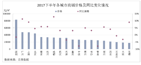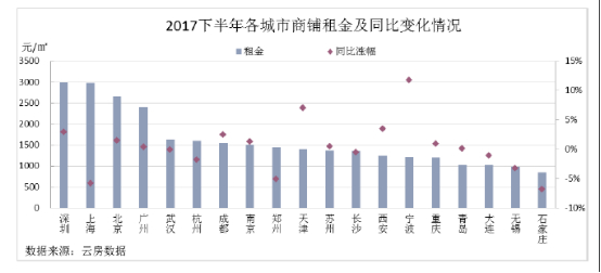 可以看到的是,商铺市场体验创新动作频频,体验式消费的占比越来越多,但这并不没有很好的提高租金上涨增速。在全国众多城市住宅限购的环境下,新业态、新品牌的孵化发展迅速,商铺作为一个相对稳定的投资产品,具有一定的市场优势,《报告》显示,大部分中南部部城市价格涨幅显著,2017下半年,成都、广州、上海价格涨幅最为显著,青岛、宁波同比涨幅为负。