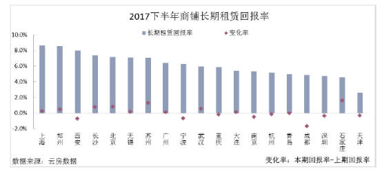 长期租赁虽部分城市回报率较高,但整体趋势仍以下行为主。考虑长期租赁租金涨幅后,商铺市场回报率多集中在4.6%-8.6%,唯天津回报率明显低于全国平均水平,2017下半年仅为2.6%。上海、郑州、西安由于消费需求旺盛,商业市场租金走高回报率较高。长远来看,电商冲击导致的实体店洗牌正接近尾声,诸多企业转型或调整、收购后重新发力,未来商铺市场租赁回报率仍有一定的上涨空间。