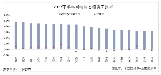 而在静态租赁方面,各城市间分化较小,大部分城市小幅上涨。2017下半年监测的19城市商铺回报率均低于五年期贷款利率4.9%,且各城市间分化较小。分城市看,北京成熟非核心区的部分项目租金增长较为明显,回报率涨幅显著,跃居首位;而深圳则由于新增的大型购物中心在非核心区域,租金表现稳定,回报率为3.2%。