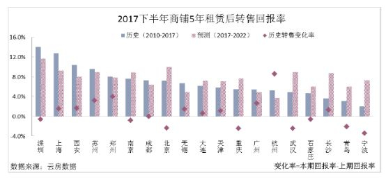 《报告》显示,大部分城市未来预测转售回报率走高,而深圳、上海等城市则由于前期商业需求的过度透支,转售回报率继续回落。