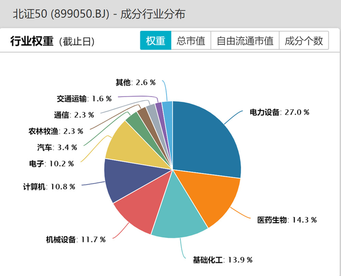 北证50前五大权重行业分别是电力设备(27.0%)、医药生物(14.3%)、基础化工(13.9)、机械设备(11.7%)和计算机(10.8%),行业分布相对均衡,大都是科创属性突出的新新兴行业。