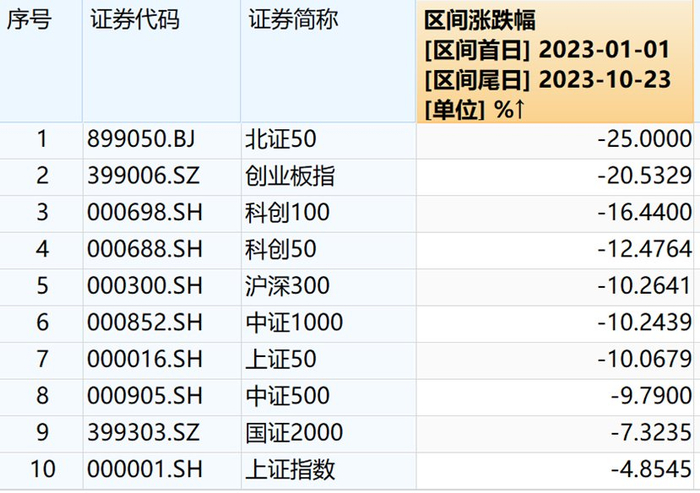 一个月前我做过一个统计,当时北证50是今年以来宽基指数当中表现最差的,截至10月23日累计下跌了25%,可以用一个“惨”字来形容。