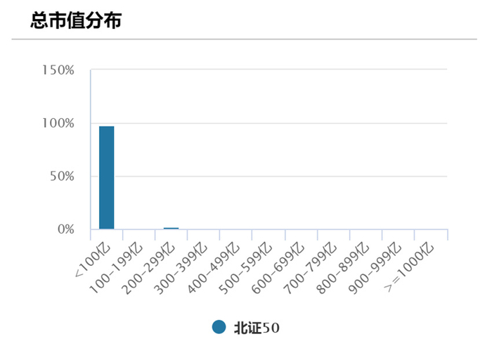北证50成分股中,98%的市值都低于100亿元,成分股总市值平均值为26.66亿元,中位数为14.67亿元,市值最小的仅为7.53亿元,可以说是微盘中的微盘了。