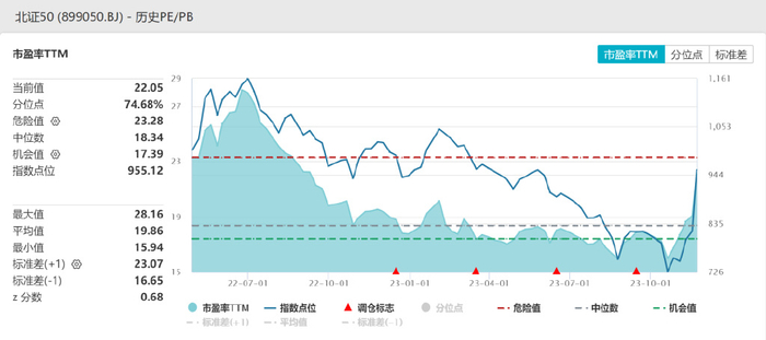 经历了一波上涨之后,目前北证50的市盈率(TTM)也只有22倍,相比之下,同为小市值指数的国证2000市盈率是48倍,同为创新成长标签的创业板指数市盈率是29倍。