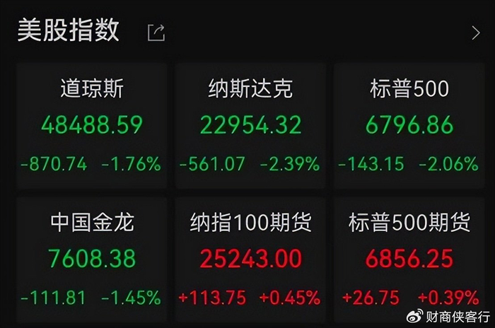 美股集体跳水,纳斯达克指数下跌2.39%,标普500下跌2.06%,道琼斯指数下跌1.76%。
