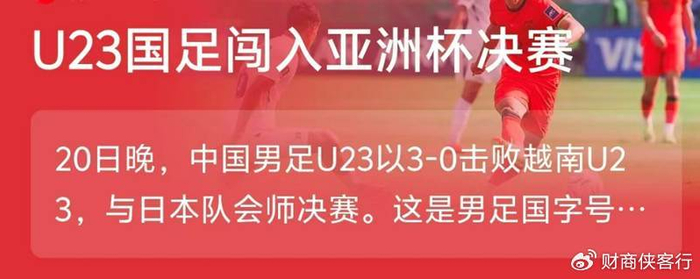 这是U23亚洲杯举办以来,中国队首次摸到决赛地板,也是中国男足国字号球队22年来有机会再度争冠。不少网友感慨:中国足球,或许真的要触底反弹了。