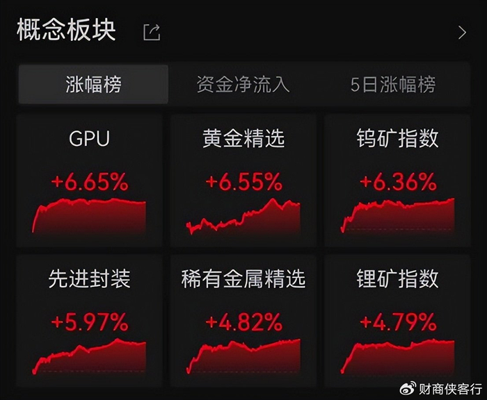 概念板块中,GPU暴涨6.65%,黄金、钨矿、先进封装全线领涨。