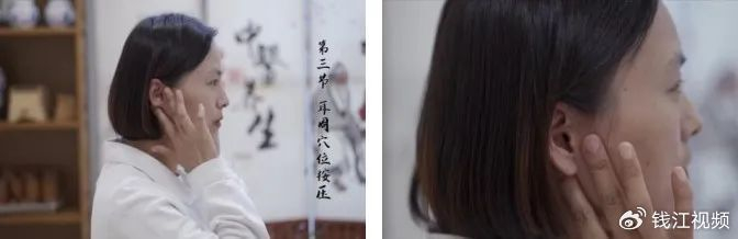 第三节 耳周穴位按压:中指放在耳前,食指放在耳后,两手指要同时用力上下推动,推40-50次作用,可按压到耳周的耳门、听宫、听会、翳风等穴位。