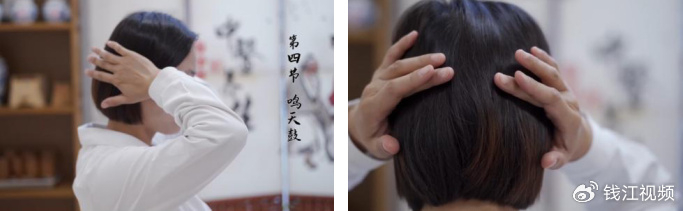 第四节 鸣天鼓:调整好呼吸,将两手手掌紧贴于外耳道口,使外耳道口暂时处于封闭状态,两手指放于枕部,食指叠于中指上,食指从中指上滑下轻轻叩于脑后枕部,左右手各叩击24次,再两手同时叩击48次。