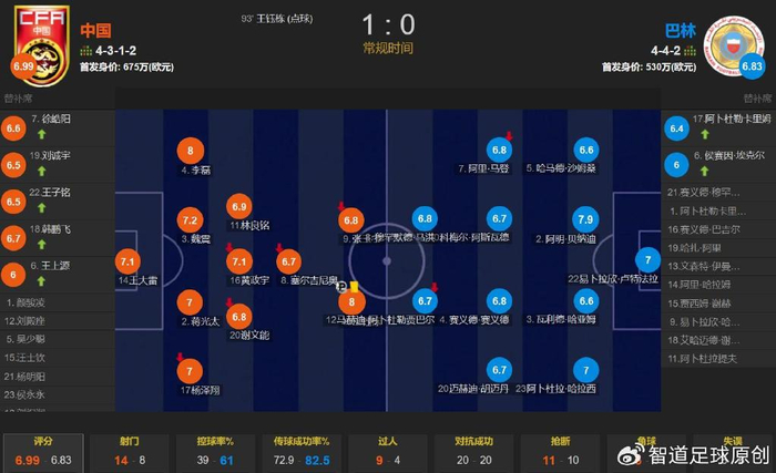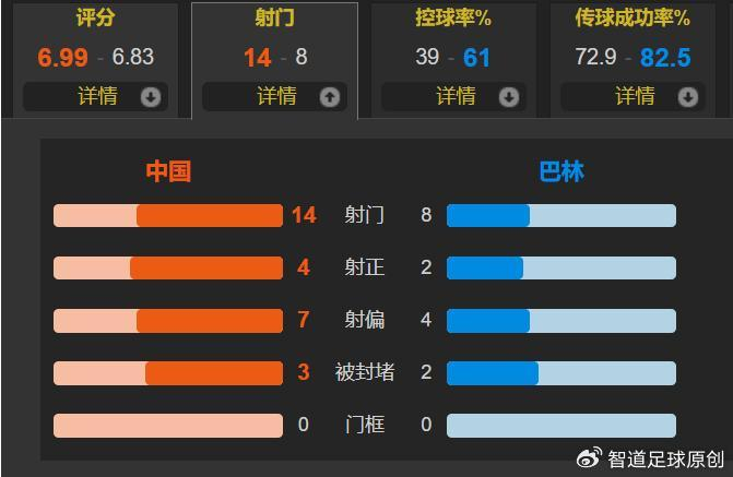 全场比赛,国足的控球率为39%,一共有14次射门,其中4次射正,巴林一共有8次射门,其中2次射正。