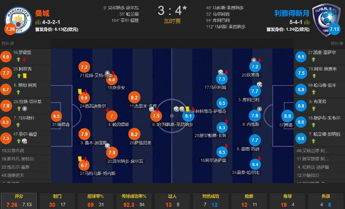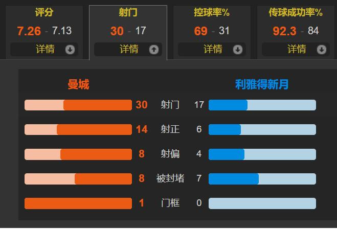 全场比赛,曼城的控球率为69%,狂射30脚,其中14次射正;利雅得新月一共有17次射门,其中6次射正,打入了4球,效率惊人。