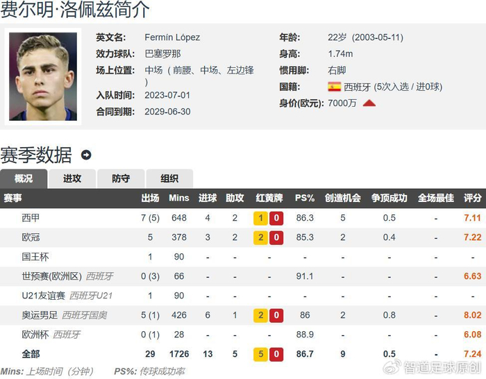 费尔明现年22岁,身高1.74米,右脚球员,主打前腰位置,德转估价7000万欧元,合同至2029年,本赛季西甲12场4球2助,欧冠5场3球2助,非常高效。