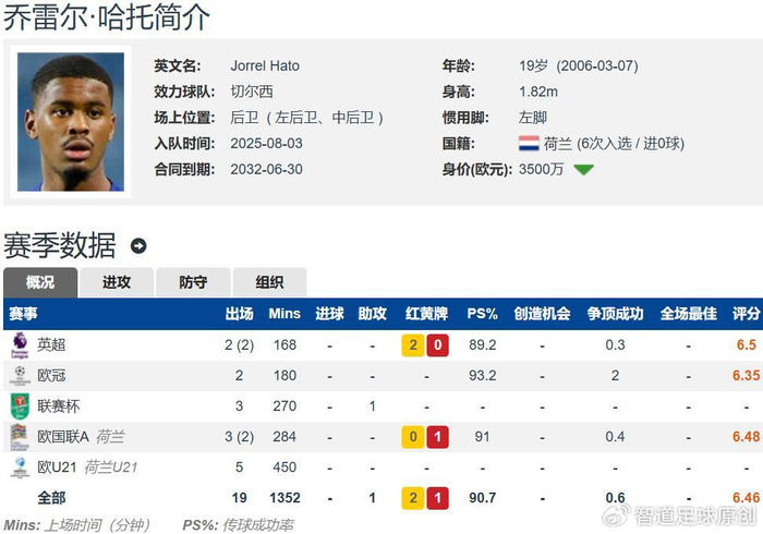 哈托现年19岁,身高1.82米,左脚球员,主打左后卫位置,德转估价3500万欧元,合同至2032年,本赛季加盟切尔西后,英超出场4次,欧冠出场2次,联赛杯出场3次,送出1次助攻。
