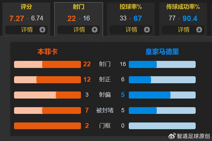 比赛数据说明本菲卡是完胜皇马,控球率本菲卡虽然仅有三成,也就是33%,但本菲卡一共有22次射门,比皇马的16次多了6次,其中本菲卡有12次射正,足足是皇马6次射正的2倍,因此本菲卡4-2击败皇马是一个非常合理比分。