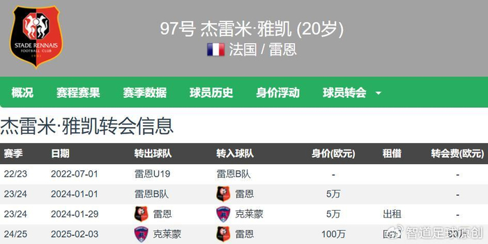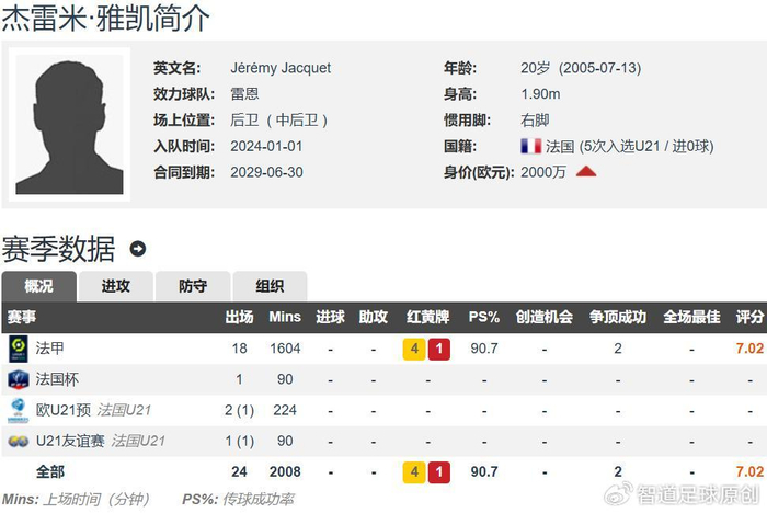 雅凯现年20岁,少年成名,身高1.90米,右脚中卫,德转估价2000万欧元,是雷恩队内身价最高的球员。雅凯本赛季法甲出场18次,全部首发,合计出场1604分钟,法国杯首发出场1次,是雷恩铁打的主力。
