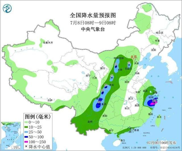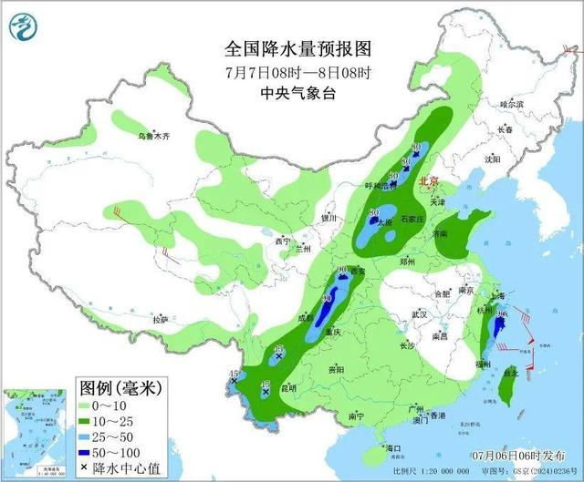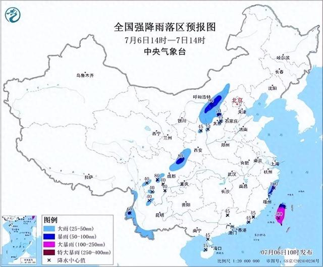 中央气象台7月6日10时继续发布暴雨蓝色预警:预计,7月6日14时至7日14时,内蒙古中部偏南地区、陕西北部和西南部、山西中北部、四川南部和四川盆地西北部、云南西部、广东北部和东部、福建东北部、浙江东南部、台湾岛等地部分地区有大到暴雨。其中,浙江南部沿海、台湾岛中南部等地部分地区有大暴雨,台湾岛南部局地特大暴雨(250~280毫米)。上述部分地区伴有短时强降水(最大小时降雨量20~50毫米,局地可超过70毫米),局地有雷暴大风等强对流天气。