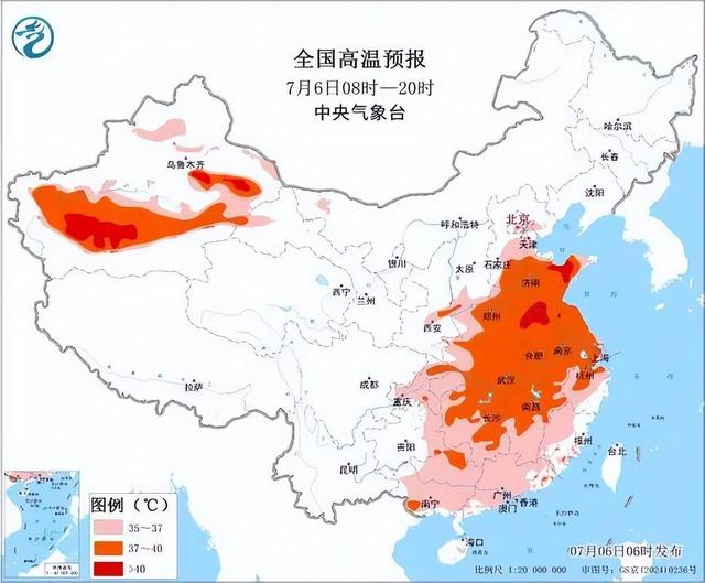 今天,高温天气仍然非常凶猛,中央气象台7月6日06时继续发布高温黄色预警:预计7月6日,华北南部、黄淮、江淮、江汉、江南大部、重庆、华南大部以及新疆南疆盆地和准噶尔盆地等地有35℃以上的高温天气。其中,新疆南疆盆地、河北南部、山东、河南、安徽、江苏、上海、湖北、湖南东部和北部、江西中北部、浙江中北部、广西北部等地部分地区最高气温37~39℃,新疆南疆盆地和吐鲁番盆地、山东半岛北部、苏皖北部等地局地可达40℃以上。