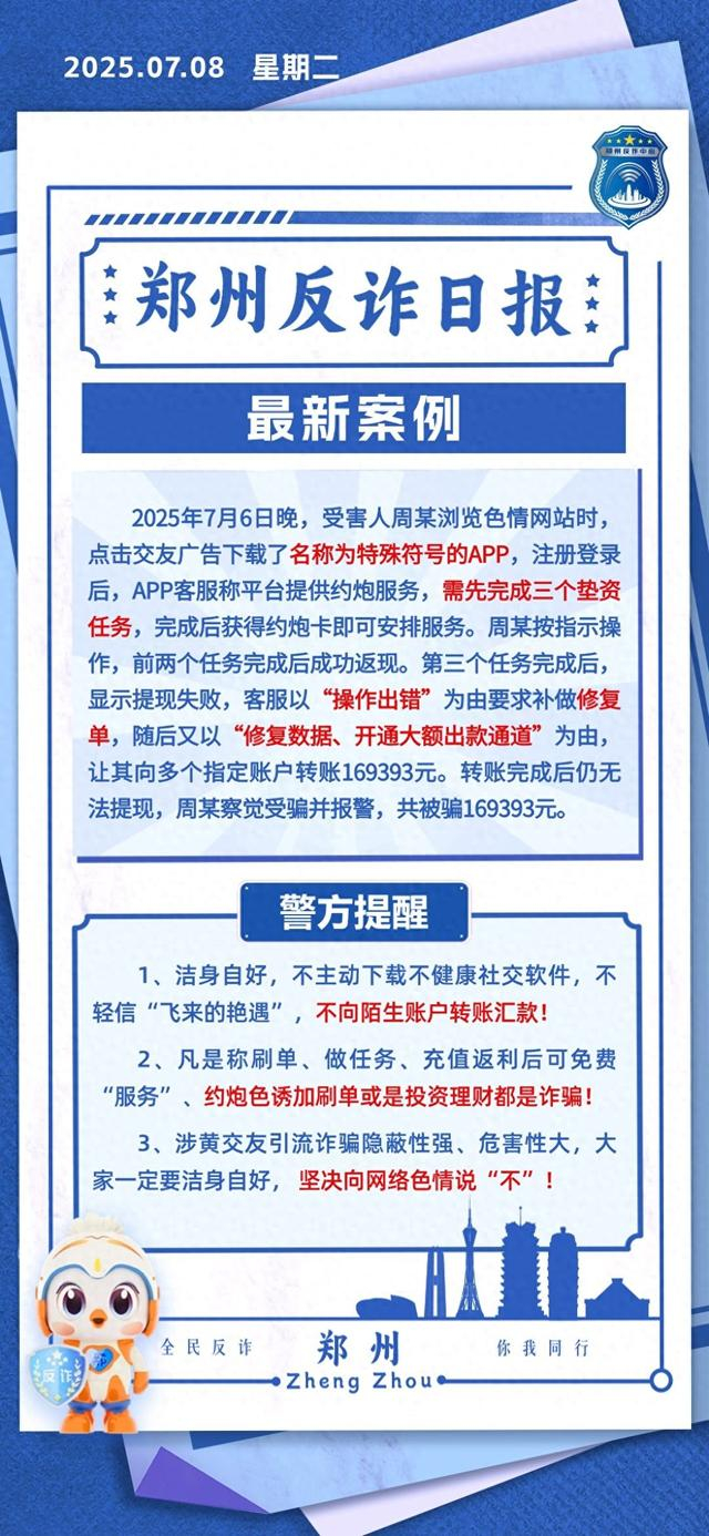 2025年7月6日晚,受害人周某浏览色情网站时,点击交友广告下载了名称为特殊符号的APP,注册登录后,APP客服称平台提供约炮服务,需先完成三个垫资任务,完成后获得约炮卡即可安排服务。周某按指示作,前两个任务完成后成功返现。第三个任务完成后,显示提现失败,客服以“操作出错”为由要求补做修复单,随后又以“修复数据、开通大额出款通道”为由,让其向多个指定账户转账169393元。转账完成后仍无法提现,周某察觉受骗并报警,共被骗169393元。
