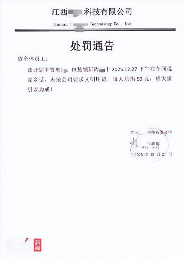 记者看到,这份处罚通告写道:兹计划主管郭某、包装领班周某于2025.12.27下午在车间说家乡话,未按公司要求文明用语,每人乐捐50元,望大家引以为戒。落款为江西某科技公司行政部,时间为2025年12月27日。有网友评论,是不是两人用家乡话骂人才被处罚,发布这则处罚通告的网友回复称,两名员工并未骂人,是在用家乡话谈论工作,新来的经理听不懂。在车间说了几句家乡话就被处罚,不少网友表示了不解,认为这样的规定明显不合理。还有网友质疑,乐捐其实就是变相的罚款,同样不合理且涉嫌违法。