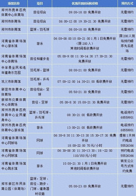 郑州市“元旦”假期免费或低收费开放的公共体育场馆、项目、时间如下: