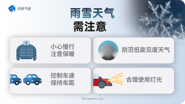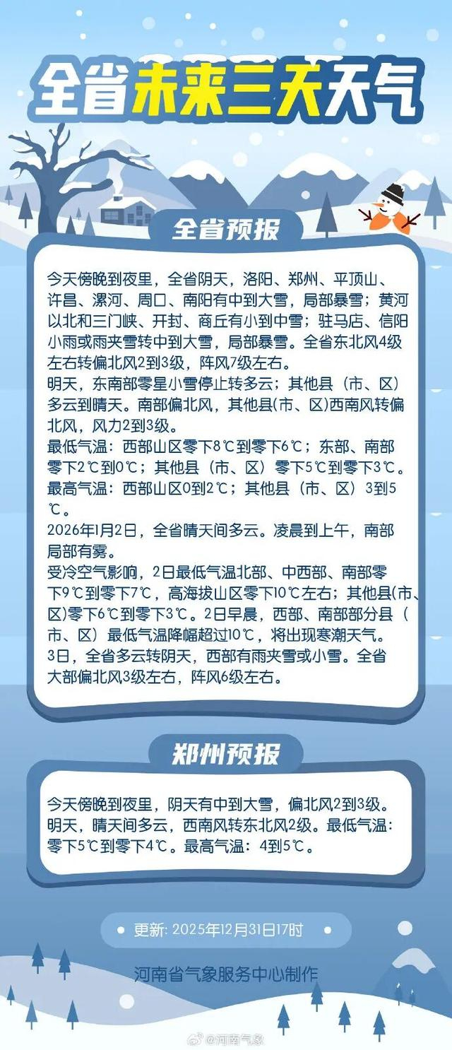 今天下午到夜里,全省阴天,三门峡、洛阳、郑州、平顶山、许昌、漯河、南阳有中到大雪,局部暴雪;黄河以北和开封、商丘有小到中雪,山区局部有大雪;周口、驻马店、信阳小雨或雨夹雪转中到大雪,局部暴雪。全省东北风4级左右,阵风7级左右。