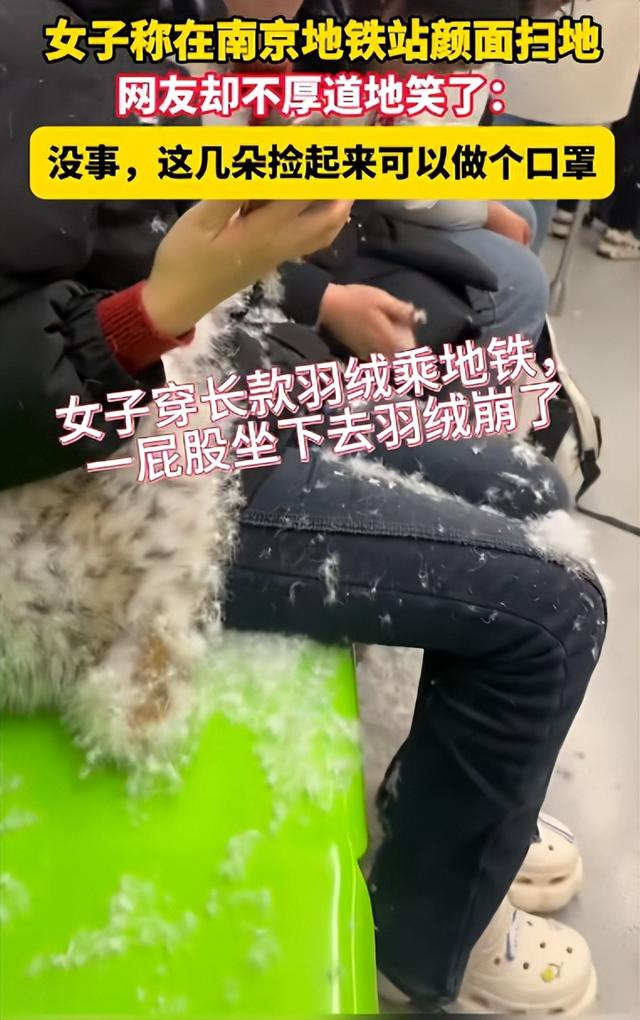 今年2月4日,江苏南京地铁上,一女子身穿长款羽绒服,一屁股坐下去时羽绒服崩了。