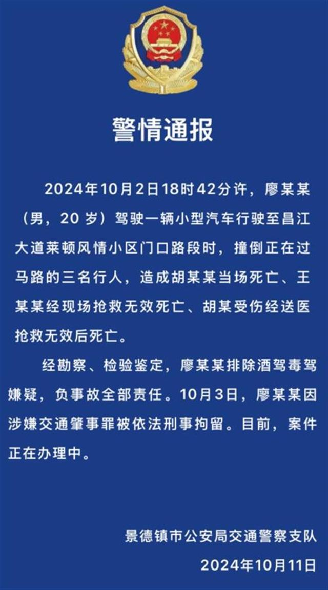 事发画面据景德镇警方通报,2024年10月2日18时42分许,廖某某(男,20岁)驾驶一辆小型汽车行驶至昌江大道莱顿风情小区门口路段时,撞倒正在过马路的三名行人,造成胡某某当场死亡、王某某经现场抢救无效死亡、胡某受伤经送医抢救无效后死亡。经勘察、检验鉴定,廖某某排除酒驾毒驾嫌疑,负事故全部责任。10月3日,廖某某因涉嫌交通肇事罪被依法刑事拘留。