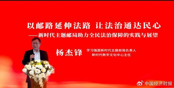 学习强国新时代主题邮局负责人杨杰锋发表了题为《以邮路延伸法路,让法治通达民心》的演讲。他阐述了主题邮局作为新型法治文化宣传阵地的独特优势,提出通过“邮路延伸法路”,让法治服务借助邮政网络通达基层、深入民心。杨杰锋指出,邮政网络遍布城乡、深入社区,具有天然的覆盖优势和深厚的群众信任。“法治保障卡”与主题邮局的结合,能够实现法治理念与邮政文化的深度融合、数字权益与实体网络的虚实融合。他介绍,双方将通过共建“法邮文创”、共拓服务流程、共推公益传播,让法治服务借助邮政网络真正打通“最后一公里”。