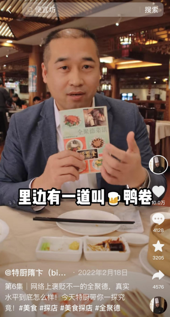 隋坡探店中有一回隋坡探店全聚德。他收藏了一本1990年出版的《全聚德菜谱》,仔细阅读过。那天探店,他特意带上了这本旧书。