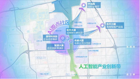 该街区以五道口3公里区域为核心,突出清华+北大+中科院+智源+奇绩创坛+N个创新企业的独一无二生态聚合效应,整合东升大厦、清华科技园、智源大厦等载体,打造百万平方米产业空间,形成“两核爆点+两支撑极”布局,同时辐射带动区域涵盖学北园、东升三期和京张遗址公园人工智能产业创新带。