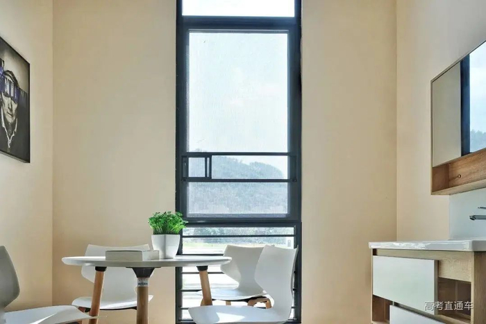 但麻雀虽小五脏俱全哦,每个宿舍配有阳台、独卫、热水器、饮水机、空调、书桌,甚至还有电视!并且24h不断电不断网。