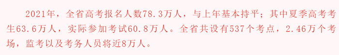 2023年,全省普通高考应考考生近73.9万人,实考70万人,实考率与去年基本持平。全省共设考点519个、常规考场2.58万个、启用185个备用考场。