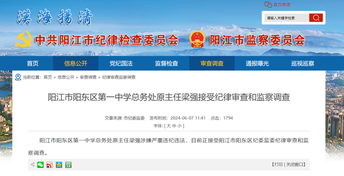 此外,据漠海扬清2024年6月7日消息,阳江市阳东区第一中学总务处原主任梁强接受纪律审查和监察调查。