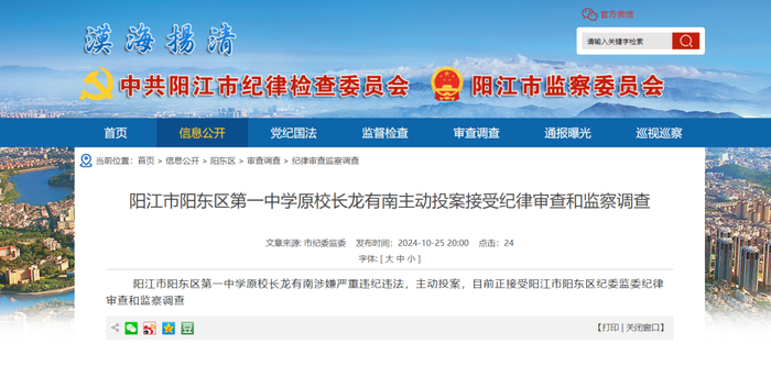 据漠海扬清2024年10月25日消息,阳江市阳东区第一中学原校长龙有南涉嫌严重违纪违法,主动投案,目前正接受阳江市阳东区纪委监委纪律审查和监察调查。
