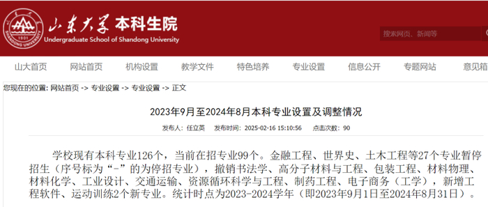 2月16日,山东大学发布《2023年9月至2024年8月本科专业设置及调整情况》。