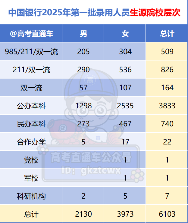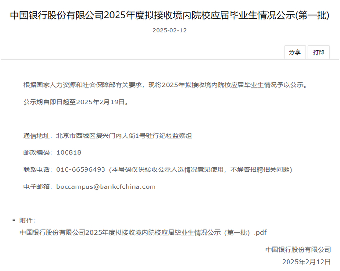 2月12日,中国银行股份有限公司2025年度拟接收境内院校应届毕业生情况公示(第一批)公布,共录用6103人。