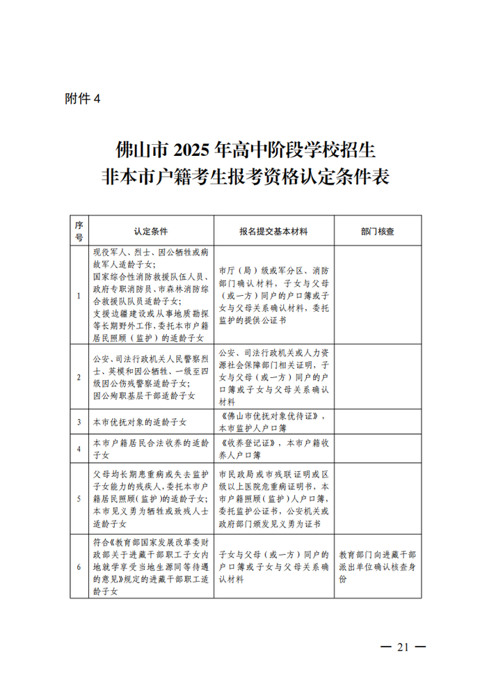 6.在我市就读的非本市户籍(含港、澳籍及外籍)初中应届毕业生,若其父母(法定监护人)至少有一方符合以下政策性照顾条件,须到就读学校提交申请,并按要求提供有关证明材料,经有关部门审核通过后,可报考我市公、民办普通高中和公、民办综合高中普高班,与本市户籍应届毕业生同等录取: