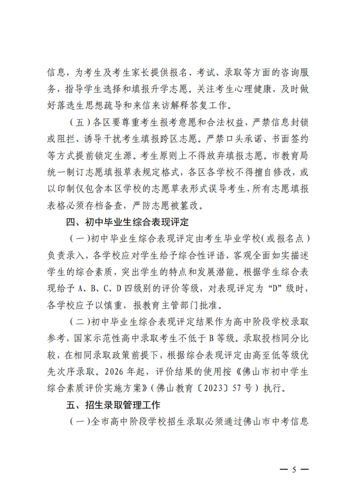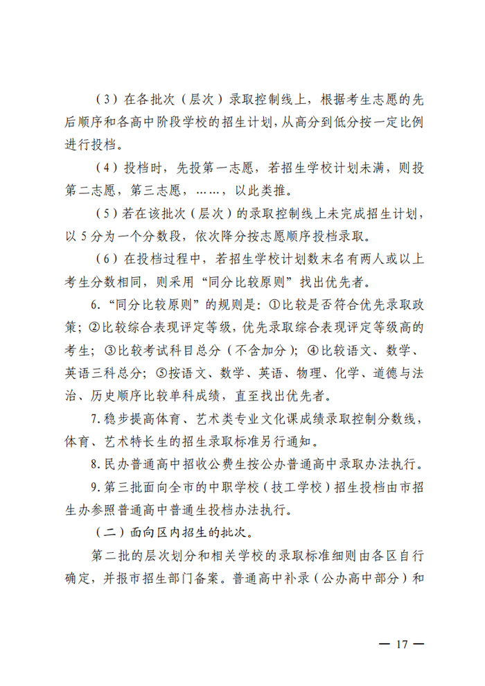 1.公平、公正、公开原则。学校招生工作遵循公平、公正、公开的原则,从考生德智体美劳全面衡量,保障考生合法权益。录取时,根据考生志愿、综合素质评价等级、考查科目等级和初中学业水平考试成绩总分分批择优录取。凡是未参加我市中考的考生,我市普通高中学校不予录取;凡是志愿填报不合理的考生自行承担未被录取责任;凡是录取后未在规定时间内到校注册的考生,视为自愿放弃被录取学校当年的录取资格,不建立学籍。