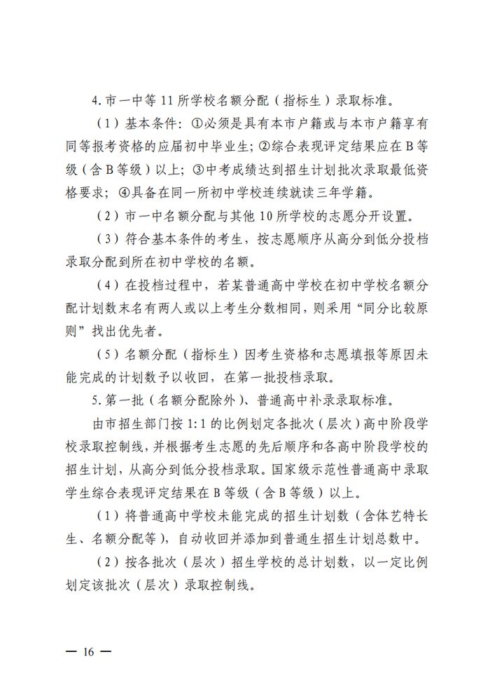 2.完善高中阶段学校招生录取办法。高中阶段学校坚持并完善计分科目、等级科目、综合素质评价相结合的综合录取办法。把等级科目考试成绩的等级、综合素质评价结果作为招生录取依据。在普通高中招生时,公办普通高中(含综合高中班、民办高中具有公费性质的招生计划,如民办学校公费生、普惠生招生计划)投档考生的等级科目(生物学、地理、信息科技、艺术等科目)成绩均须达到B级及以上。