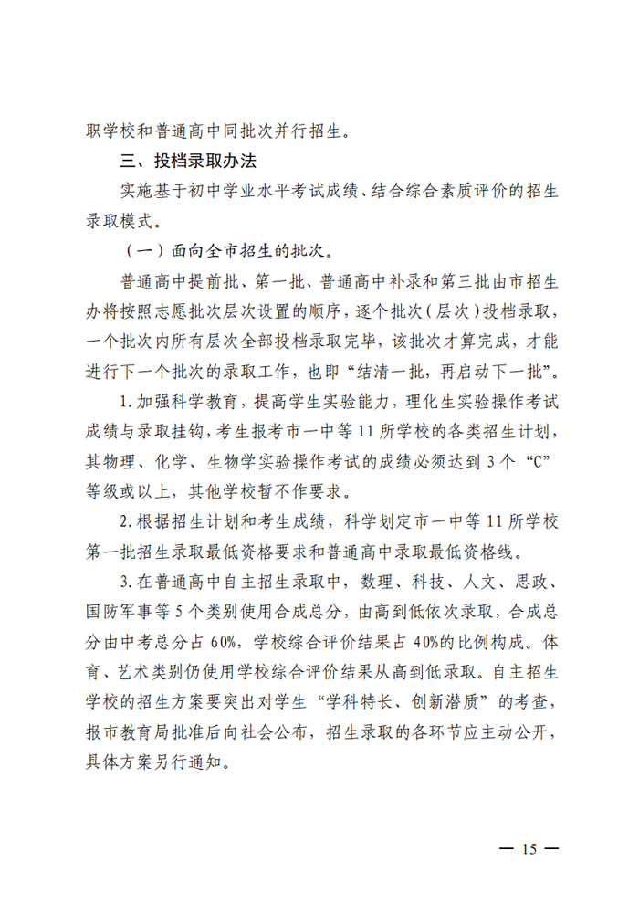 3.规范招生录取批次设置。优化录取批次设置,原则上分为自主招生、名额分配招生、统一招生3个类别。结合本地实际确定各类学校各批次的志愿数和录取资格分数线,并制定具体实施方案,结合考生学考成绩、综合素质评价结果及志愿填报实际进行录取。各县(市、区)和招生学校要进一步加强和规范中考志愿填报咨询服务工作,正确指导学生进行志愿填报。