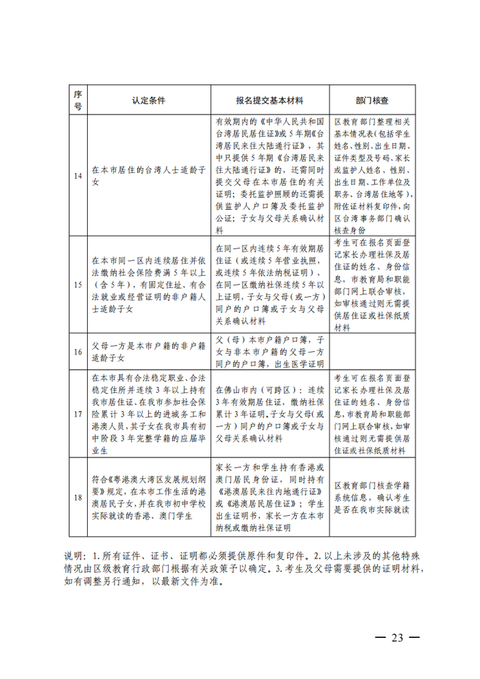 1.在我市就读的异地务工人员随迁子女(以下简称“随迁子女”),截至随迁子女参加中考当年的8月31日,随迁子女具有我市初中阶段三年完整学籍,其父亲或母亲(或法定监护人)持有在我市办理的有效《广东省居住证》累计满三年及以上、按国家规定在我省依法缴纳社会保险费累计满三年及以上或在我市依法缴纳社会保险费累计满一年及以上(不含一次性缴费年限)的,到就读学校提交申请,并按要求提供有关证明材料,经有关部门审核通过后,可报考我市公、民办普通高中和公、民办综合高中普高班。