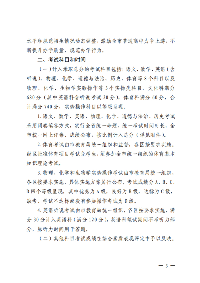 调整考试科目:考试科目包括9门文化科目:道德与法治、语文、历史、数学、英语(含听说)、地理、物理(含实验操作)、化学(含实验操作)、生物学(含实验操作)和3门其它科目:信息科技、体育与健康和艺术等科目。