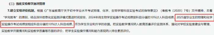 图源:深圳市教育局2025届毕业生的物理和化学实验操作考试成绩按相应科目分值的10%计入科目成绩,作为学生毕业和升学的依据。