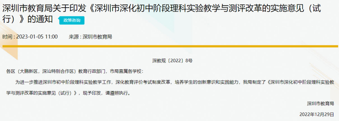 关于“深圳市教育局关于印发《深圳市深化初中阶段理科实验教学与测评改革的实施意见(试行)》的通知”表明: